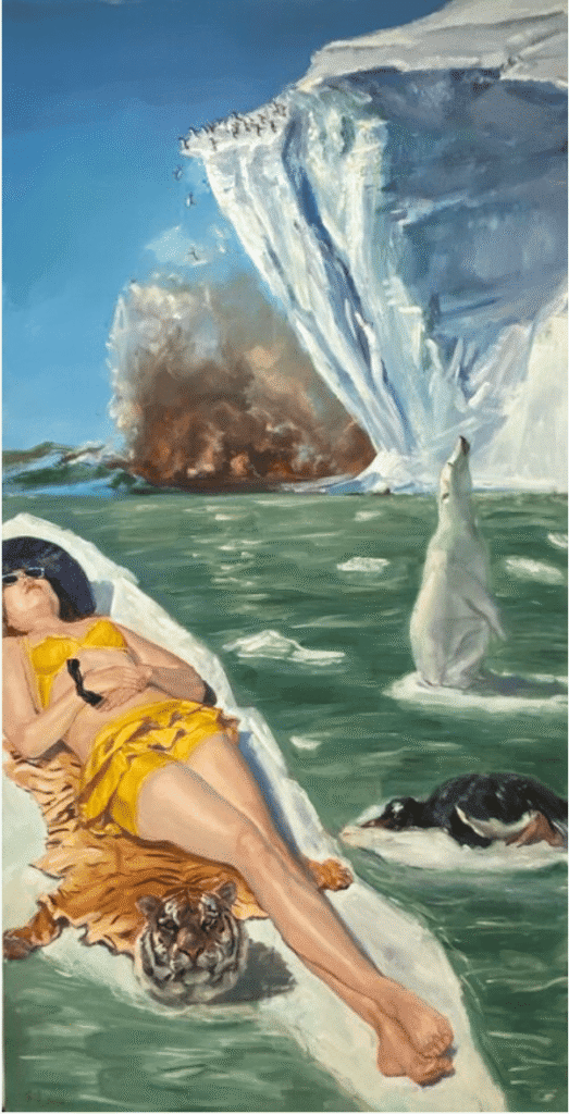 ‘In the foreground of the image, a woman is seen sunbathing on the sand—an embodiment of society’s pursuit of material pleasure. Beneath her lies a tiger skin, symbolizing the exploitation of animals and the degradation of nature at the hands of humans. Surrounding elements—melting icebergs, polar bears adrift on shrinking ice, and lifeless penguins—underscore the devastating effects of global warming and environmental destruction on wildlife.